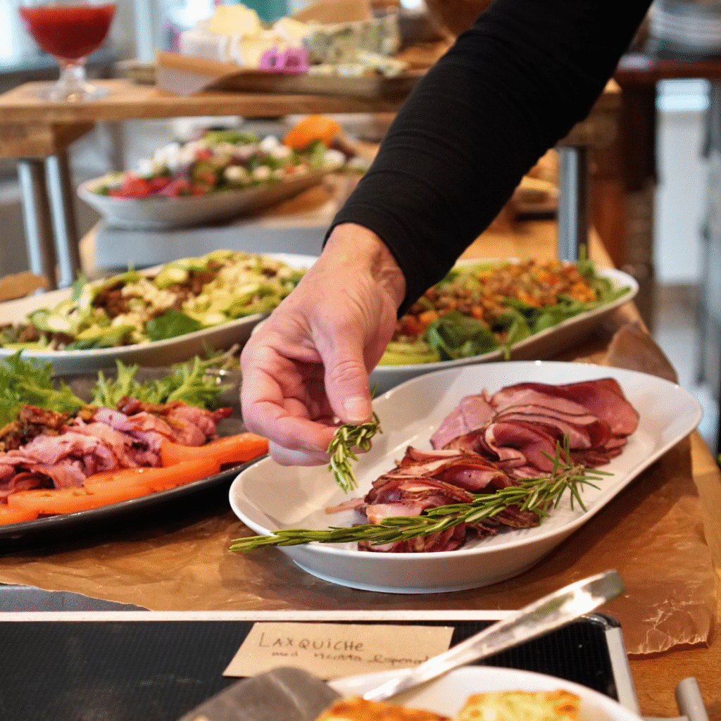 Vi dukar upp brunch med bland annat nybakat bröd, röror, sallader, kalla rätter, rostade grönsaker, nötköttbullar i ratatoille, svamprätt, matig paj med lokala råvaror från det halländska skafferiet. För det söta finns ett våffelrum där ni kan grädda egna våfflor och avnjuta hembakad kaka.